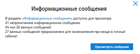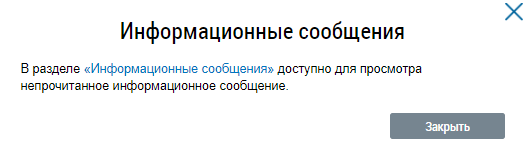 При входе в личный кабинет отображается окно с информацией о новых поступивших информационных сообщениях.