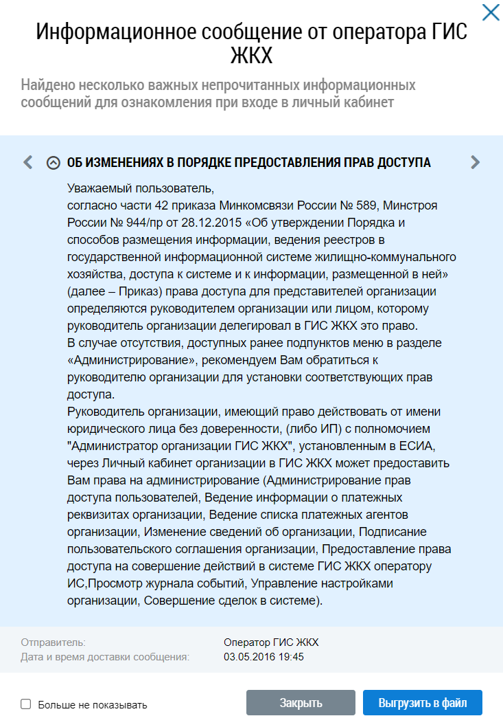 Для просмотра важных информационных сообщений нажмите на кнопку Просмотреть сообщения. Отображается окно Информационное сообщение от оператора ГИС ЖКХ.
