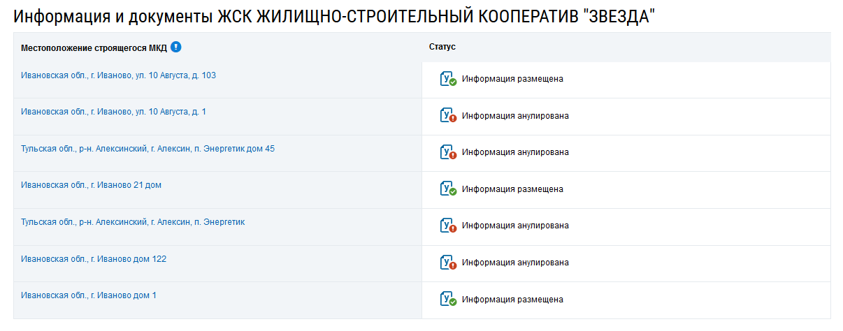 Отображается страница Информация и документы ЖСК, содержащая список строящихся МКД.