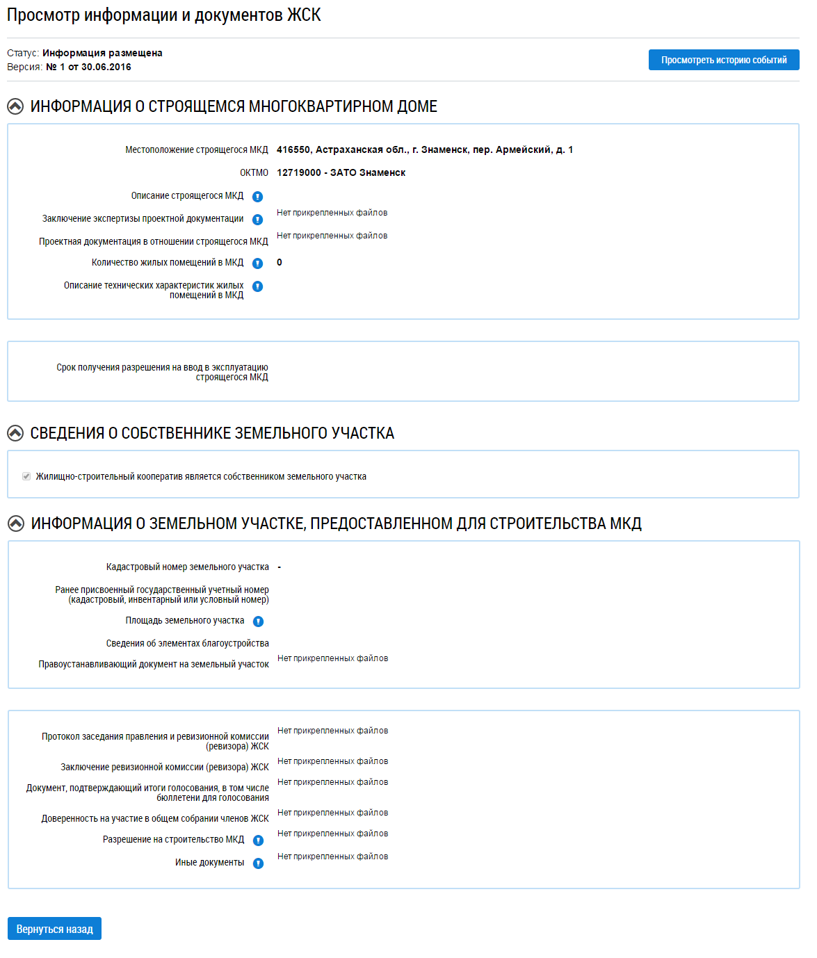 Для просмотра информации о строящемся МКД нажмите на гиперссылку с адресом дома. Отображается страница Просмотр информации и документов ЖСК.