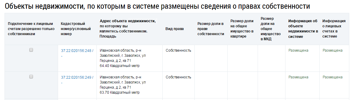 Для просмотра сведений о помещениях (жилых домах), по которым в системе размещены сведения о правах собственности,