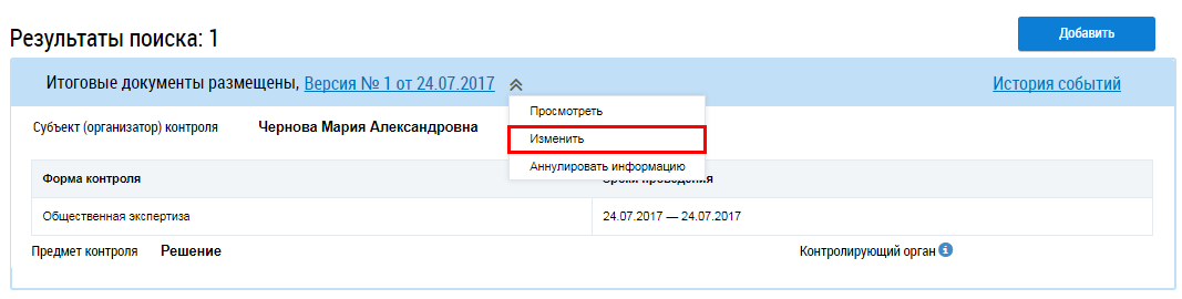 Для изменения информации о проводимых мероприятиях общественного жилищного контроля и об их результатах в статусе Проект и Решение размещено раскройте пункт контекстного меню и выберите Изменить.