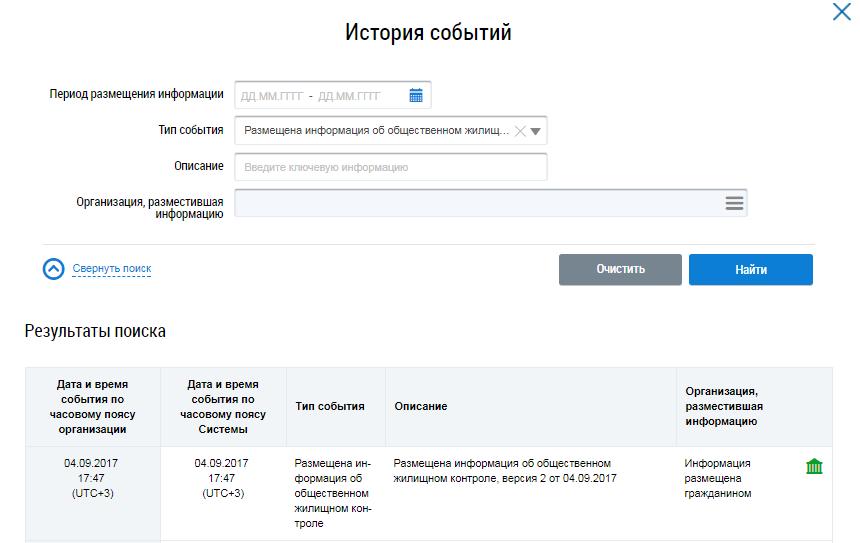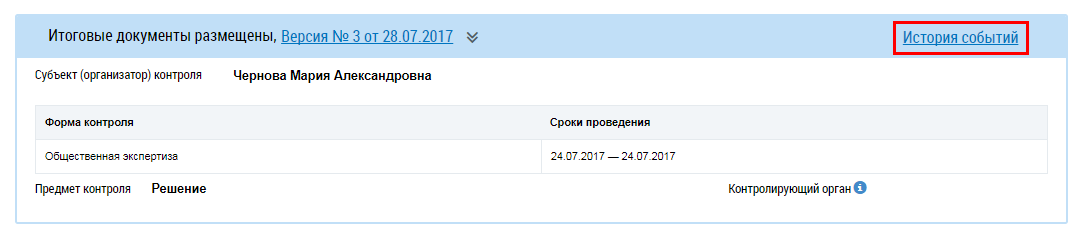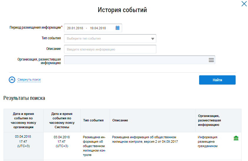 Для просмотра истории событий организации нажмите на кнопку История событий на странице Реестр информации о проводимых мероприятиях общественного жилищного контроля и об их результатах.