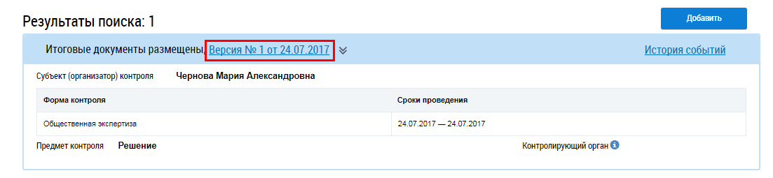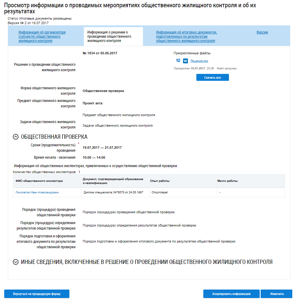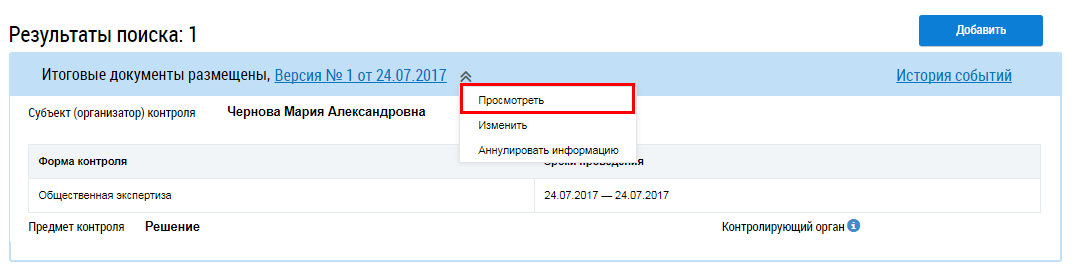 Для просмотра подробной информации о проводимых мероприятиях общественного жилищного контроля и об их результатах нажмите на гиперссылку с номером версии и датой или выберите пункт контекстного меню Просмотреть.