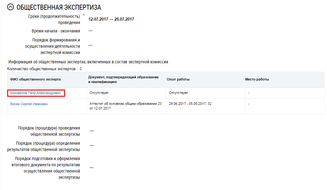 Для просмотра информации об общественном эксперте, перейдите в блок Общественная экспертиза и нажмите на гиперссылку с ФИО эксперта.