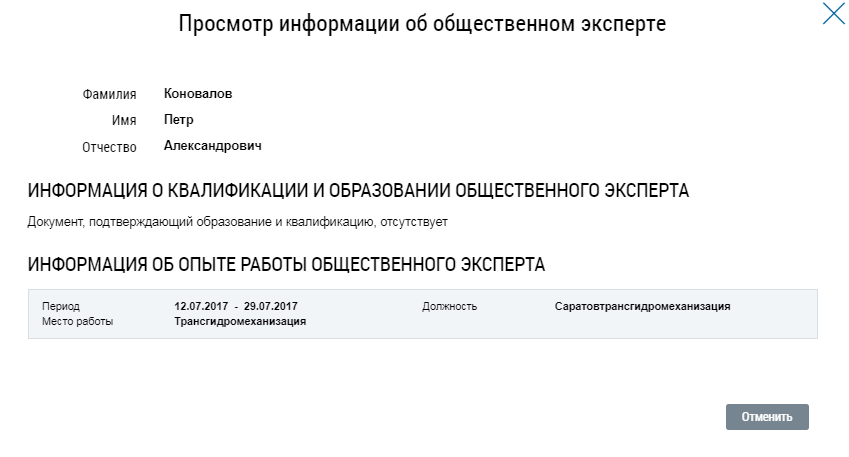 Отображается окно Просмотр информации об общественном эксперте, просмотрите информацию и нажмите на кнопку Отменить.