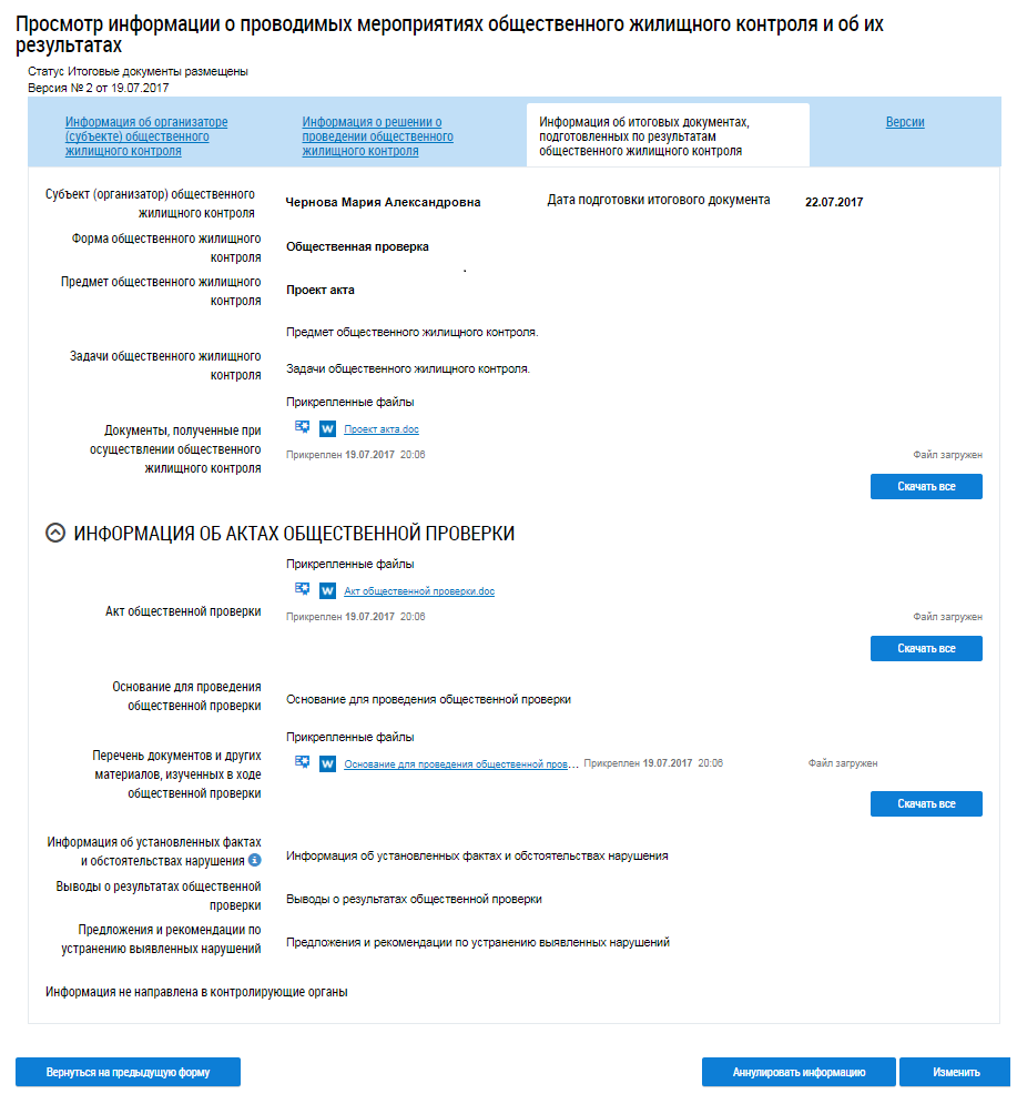 Вкладка Информация об итоговых документах, подготовленных по результатам общественного жилищного контроля доступна для просмотра только при наличии итоговых документов. Для скачивания прикрепленных документов нажмите на гиперссылку с названием документа или на кнопку Скачать все.
