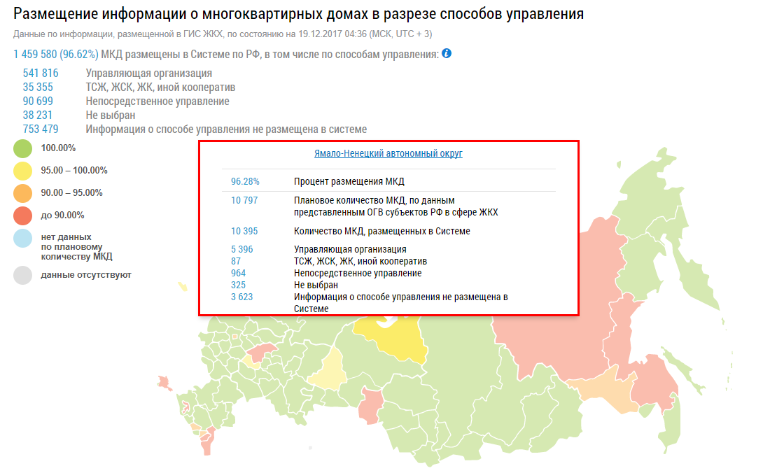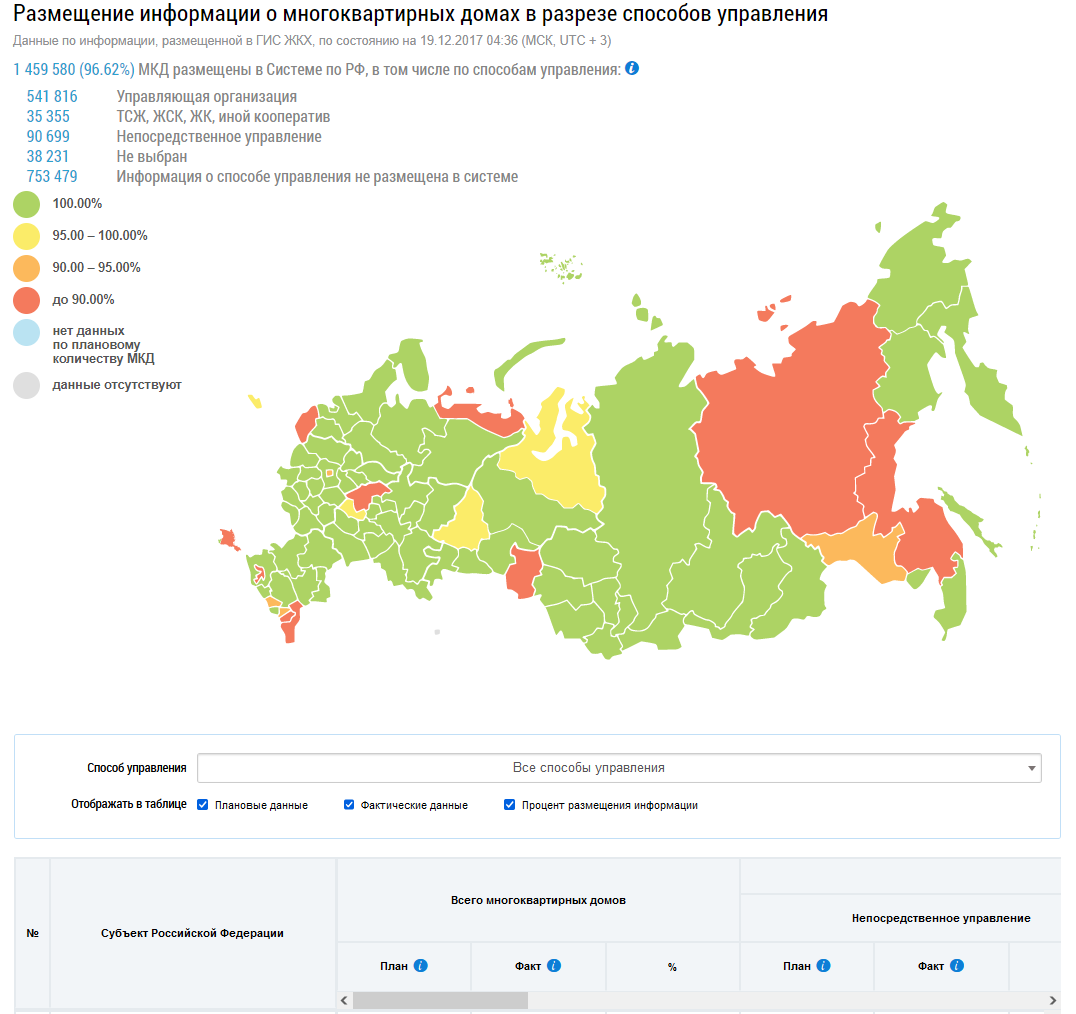 Для фильтра по отображению данных установите/снимите флажки в полях Отображать плановые данные, Отображать фактические данные и Отображать процент размещения информации. В зависимости от фильтра при наведении на карте на субъект отображается информация по распределению многоквартирных домов по способам управления.