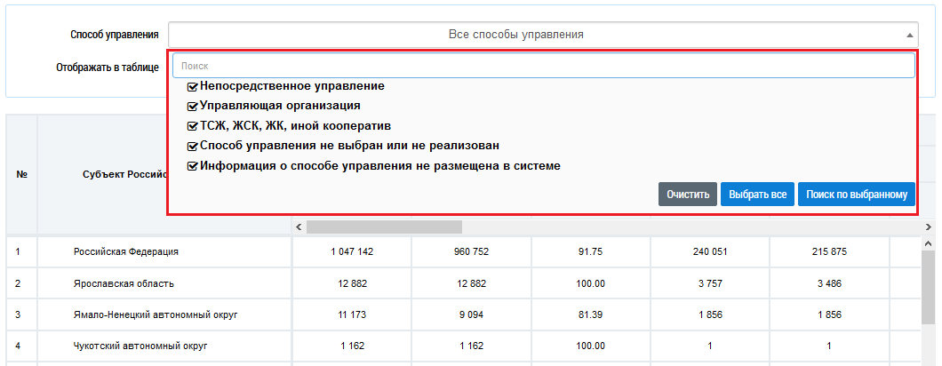 Для фильтра по способу управления установите необходимые значения в поле Способ управления. По умолчанию поиск осуществляется по всем способам управления. Для поиска по определенным способам снимите флажки и нажмите на кнопку Поиск по выбранному.