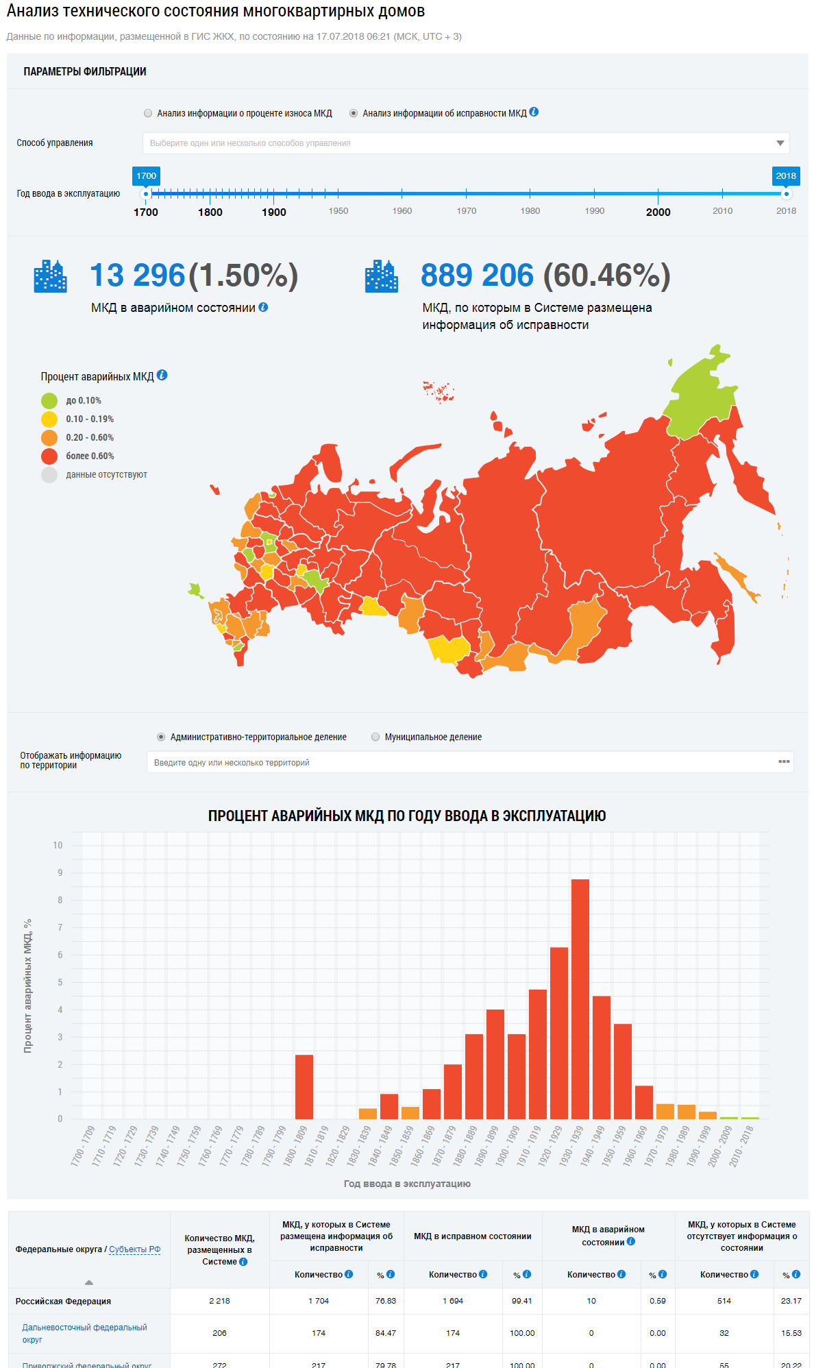 Под картой расположены блок Отображать информацию по территории, гистограмма, позволяющая наглядно посмотреть процент аварийных МКД по году ввода в эксплуатацию в различных субъектах РФ, а также таблица с подробной информацией об МКД, по которым в Системе размещена информация об исправности на выбранных территориях.