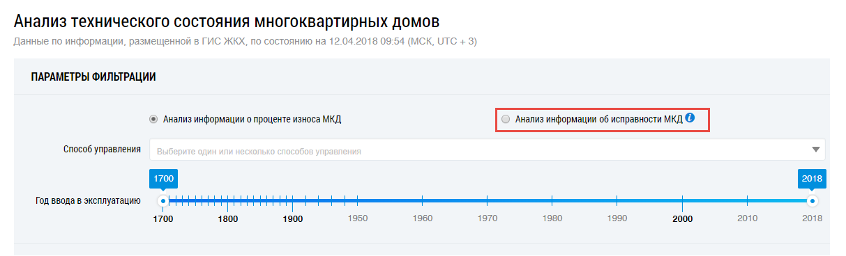 Для просмотра анализа размещенной в Системе информации о состоянии многоквартирных домов и о признании многоквартирного дома аварийным установите переключатель в поле Анализ информации об исправности МКД в верхней части страницы.