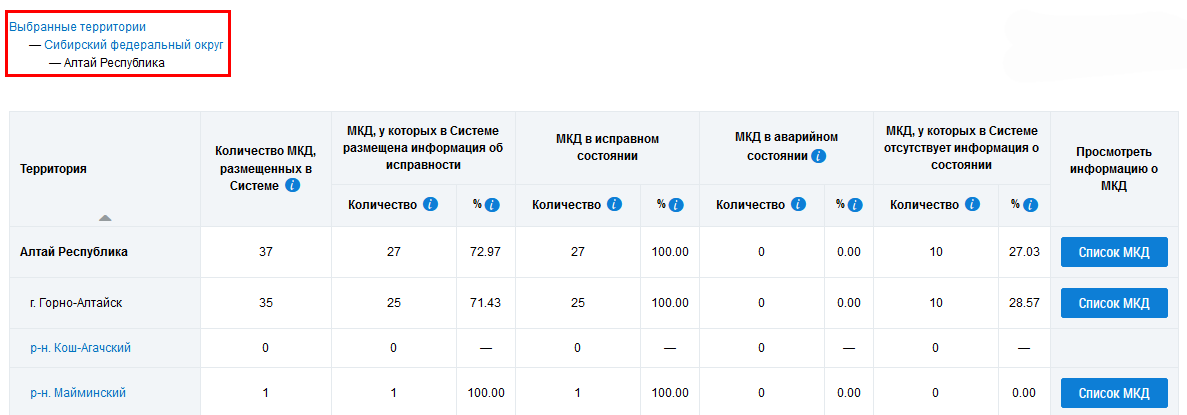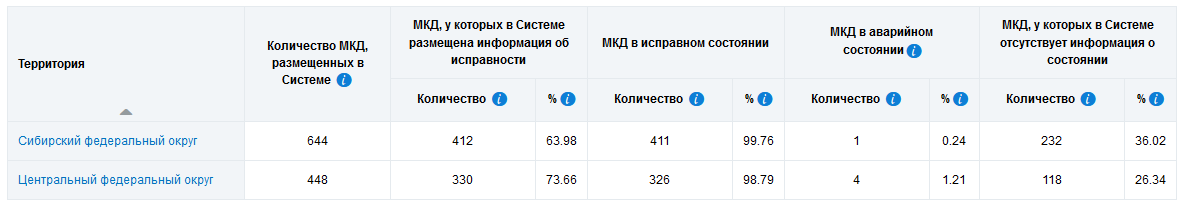 Под гистограммой расположена таблица с подробной информацией по количеству МКД, у которых в Системе размещена информация об исправности в выбранных регионах.