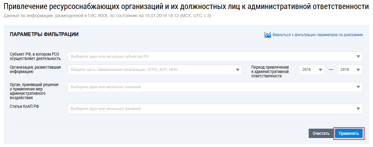 Для перехода обратно к диаграмме нажмите на кнопку Вернуться к фильтрации параметров по диаграмме. Подтвердите действие. При этом значения фильтра Статья КоАП сбрасываются.