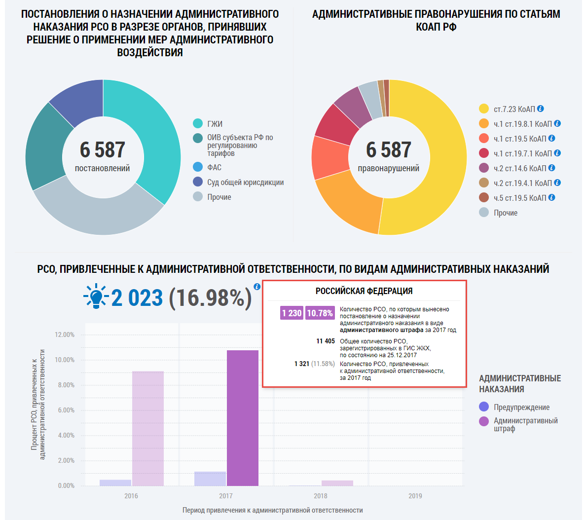 Под круговыми диаграммами формируется гистограмма с информацией о РСО, привлеченных к административной ответственности, по видам административных наказаний.