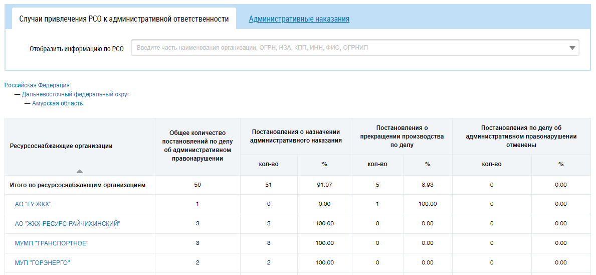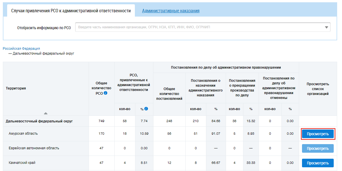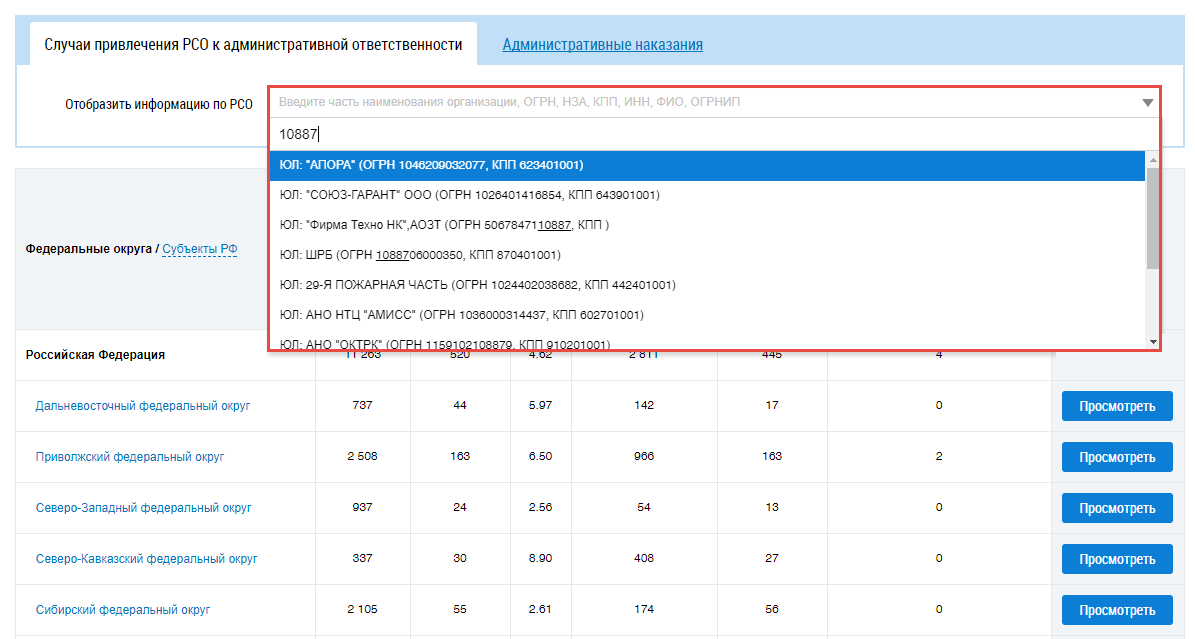Для отображения информации об организации в таблице в поле «Отобразить информацию по РСО» введите фрагмент названия, ОГРН, НЗА, КПП, ИНН, ФИО или ОГРНИП . Поисковый запрос должен содержать не менее пяти символов. Данный фильтр ищет информацию как в таблице Случаи привлечения РСО к административной ответственности, так и в таблице Административные наказания.