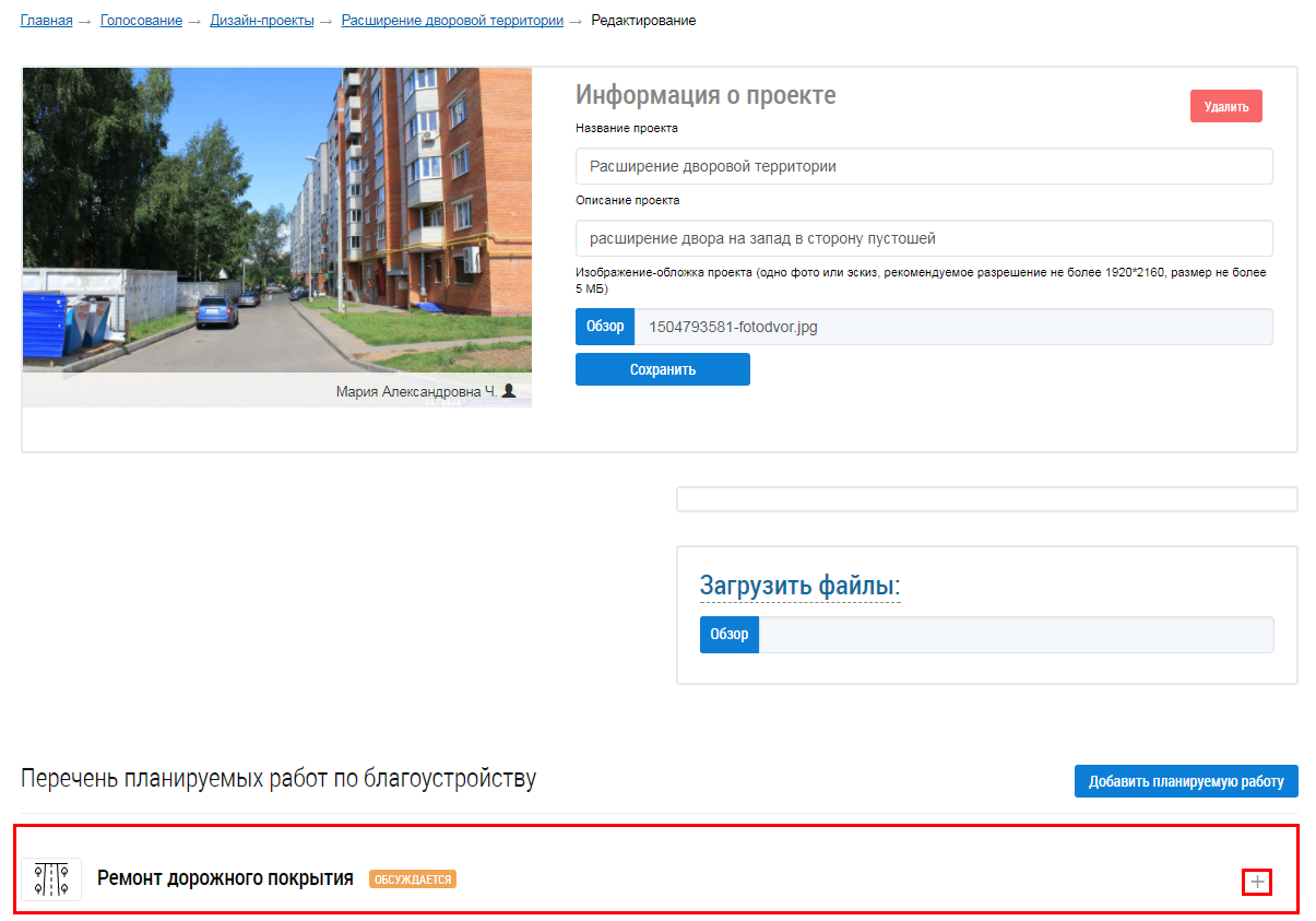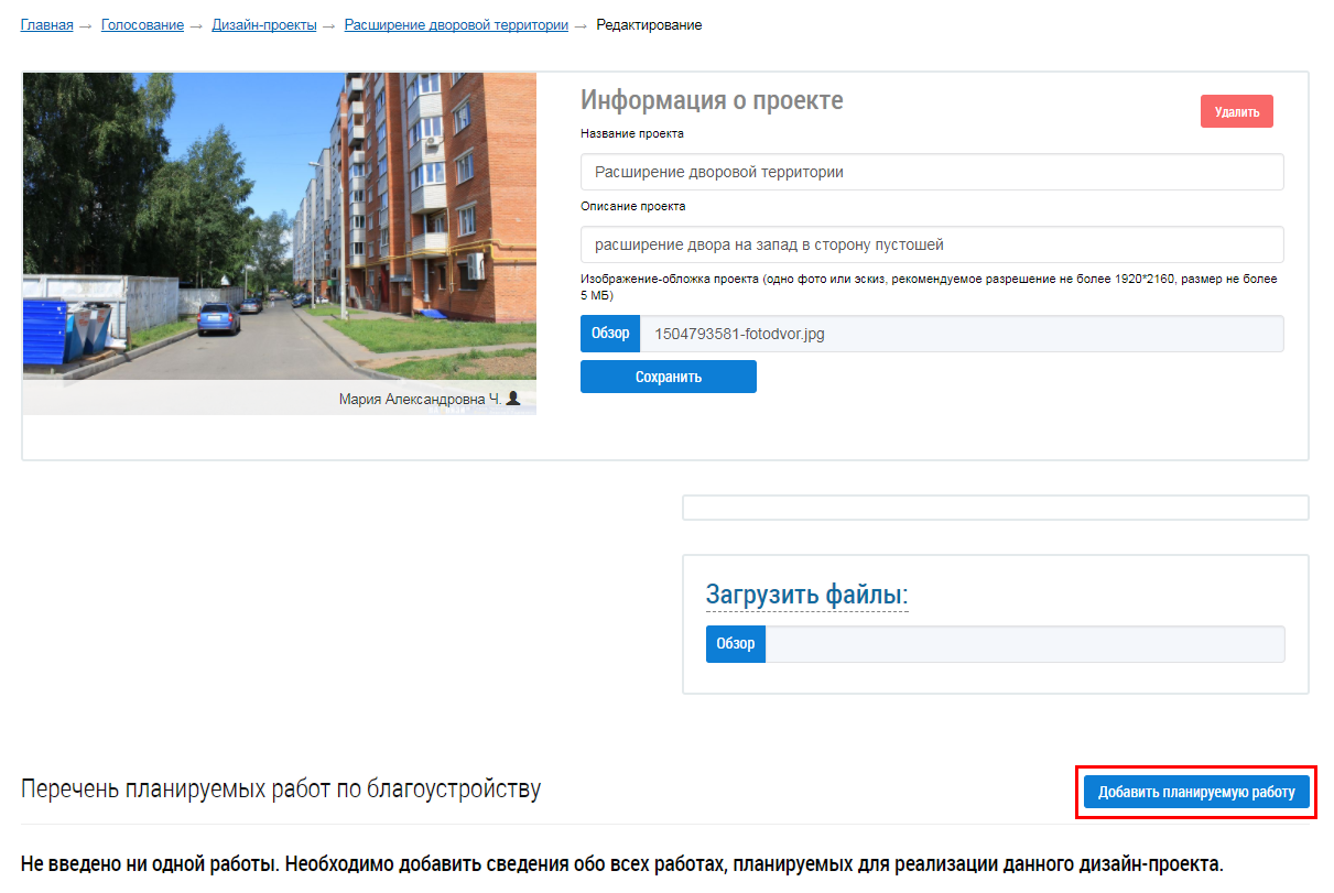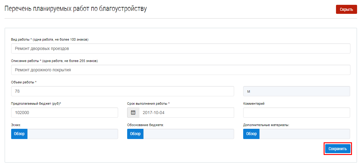 В отобразившемся блоке Перечень планируемых работ по благоустройству заполните требуемые поля и нажмите на кнопку Сохранить.