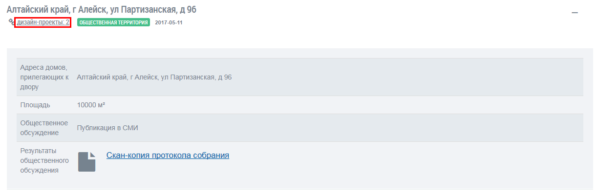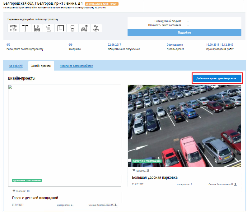 Для добавления дизайн-проектов перейдите на страницу Объекты благоустройства и нажмите на гиперссылку Дизайн-проекты.