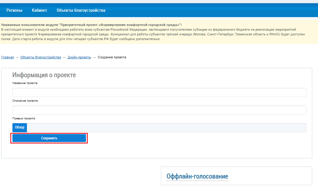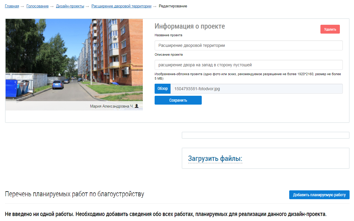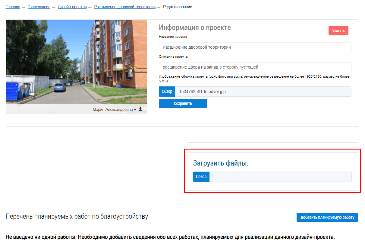 Заполните требуемые поля. Для заполнения поля Изображение-обложка проекта нажмите на кнопку Обзор. Загрузите изображение с вашего персонального компьютера. После заполнения требуемых полей нажмите на кнопку Сохранить.