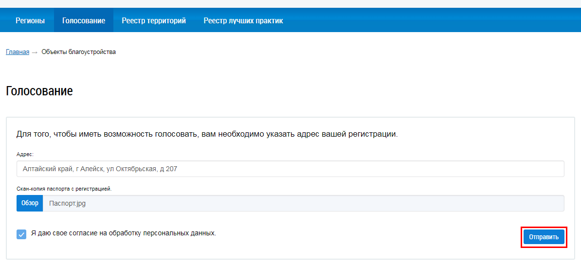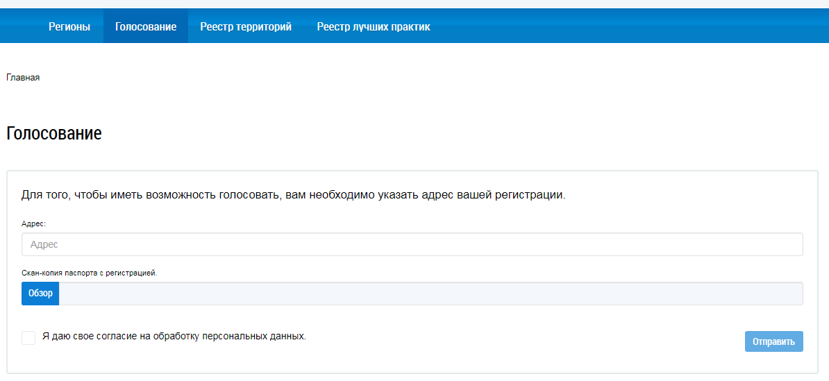 Введите адрес в соответствующее поле. Для прикрепления скан-копии страницы паспорта с регистрацией нажмите на кнопку Обзор и выберите соответствующий файл с жесткого диска вашего компьютера. Установите флажок Я даю свое согласие на обработку персональных данных и нажмите на кнопку Отправить.