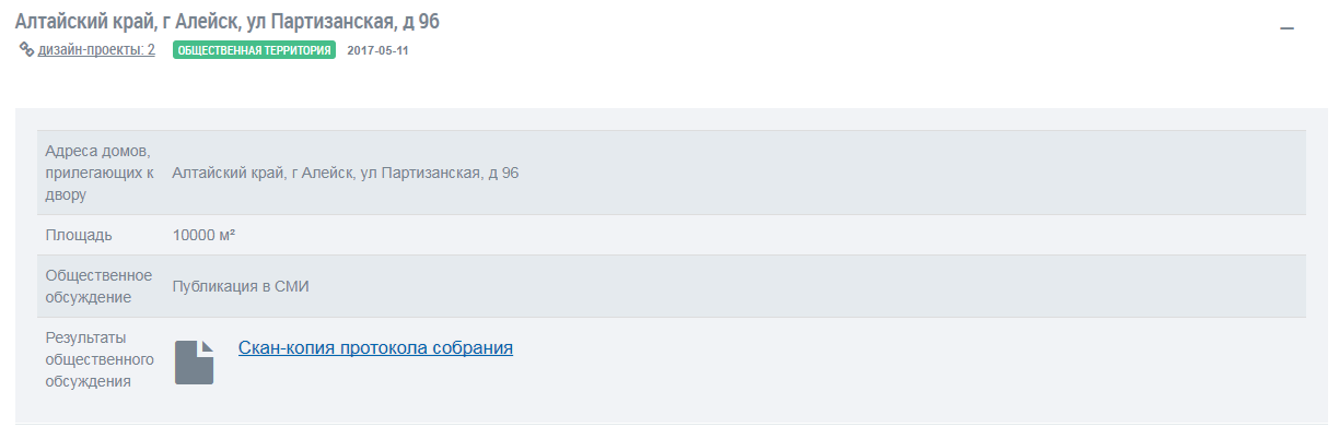 Для просмотра сведений об объекте благоустройства нажмите на гиперссылку с адресом объекта. Отображается информация об объекте благоустройства.