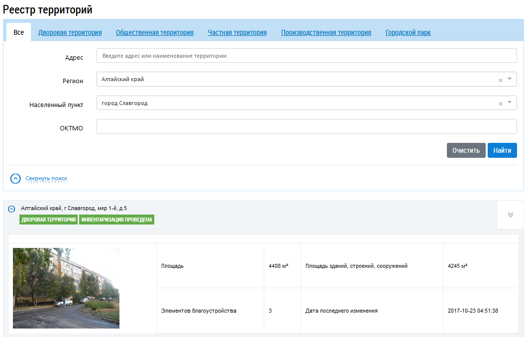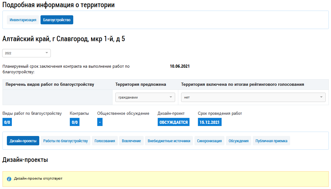 Отображается подробная информация о территории на вкладке Благоустройство.