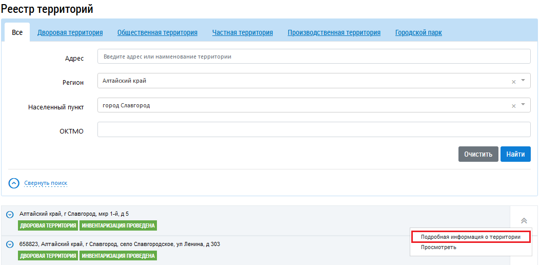 Просмотр информации о территории