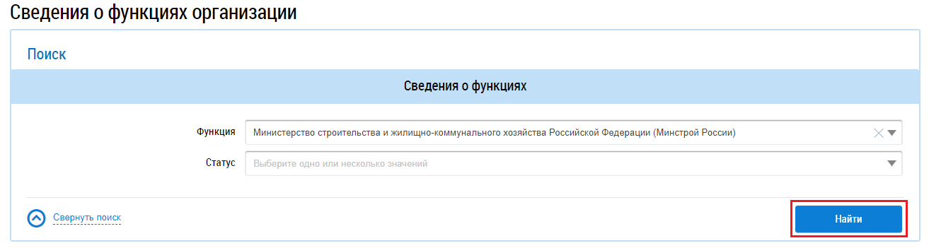 Для заполнения полей Функция и Статус следует выбрать значения из выпадающих списков. После ввода параметров поиска нажмите кнопку Найти.