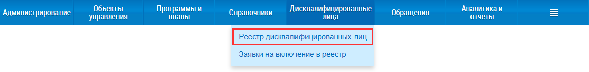 Для перехода в Реестр дисквалифицированных лиц нажмите на пункт Дисквалифицированные лица горизонтального навигационного меню и выберите пункт Реестр дисквалифицированных лиц.