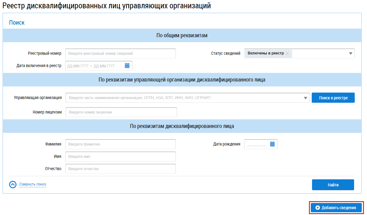 Отображается главная страница реестра. Страница содержит блок поиска по реестру, блок результатов поиска и кнопку Добавить сведения.