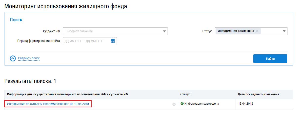 Данный раздел доступен после предоставления представителю организации прав доступа Доступ к реестру предоставления информации для осуществления мониторинга использования жилищного фонда и обеспечения его сохранности и Операции с реестром предоставления информации для осуществления мониторинга использования жилищного фонда и обеспечения его сохранности. Для получения необходимых прав обратитесь к Администратору организации.