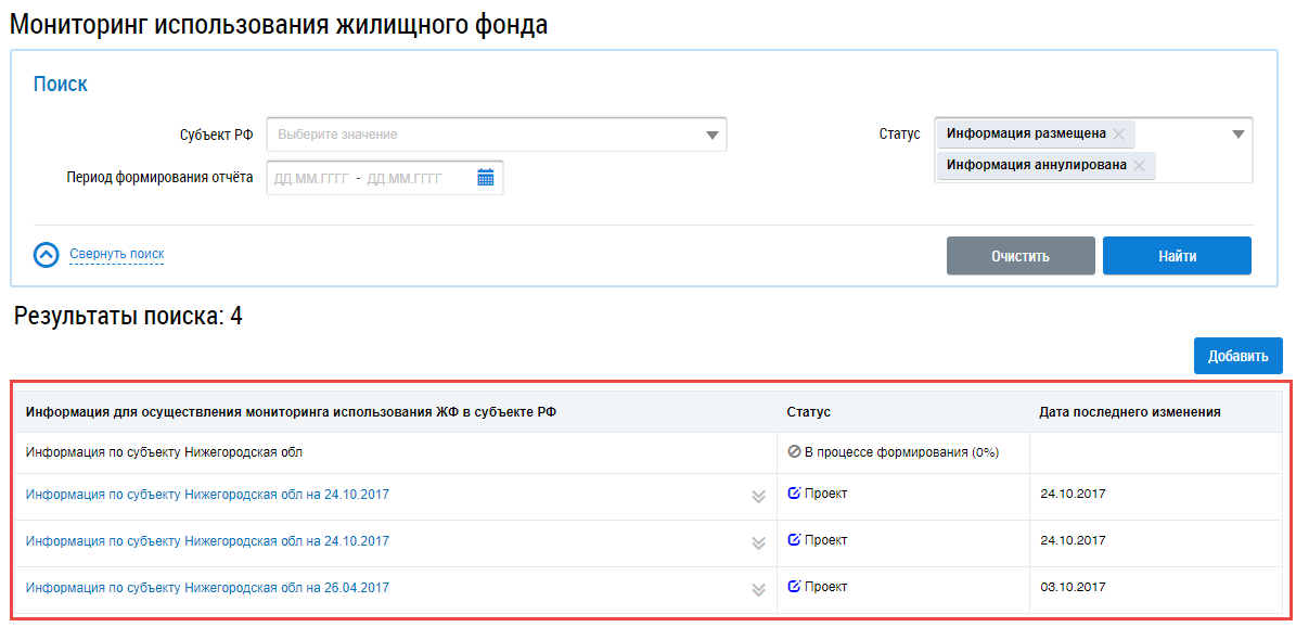 Для поиска информации для осуществления мониторинга использования ЖФ в субъекте РФ необходимо в блоке поиска задать параметры поиска, затем нажать на кнопку Найти.