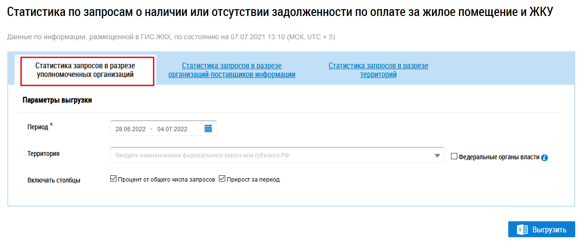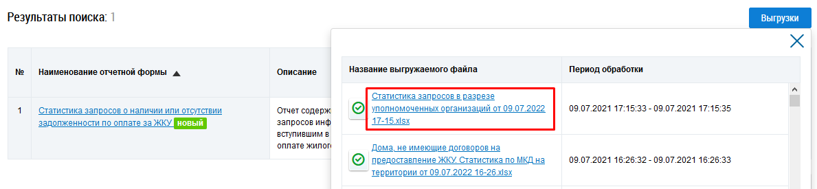 Последующие действия аналогичны тем, что описаны выше для формирования отчета в разрезе уполномоченных организаций (Страница «Статистика по запросам о наличии или отсутствии задолженности по оплате за жилое помещение и ЖКУ», вкладка «Статистика запросов в разрезе уполномоченных организаций»).