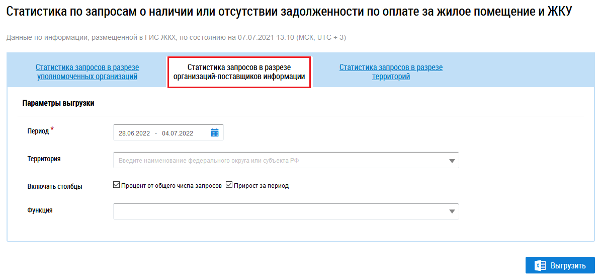 Для формирования отчета в разрезе организаций-поставщиков информации перейдите на вкладку Статистика запросов в разрезе организаций-поставщиков информации.