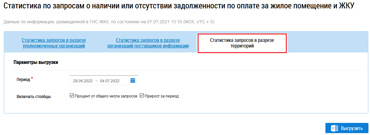 Для формирования отчета в разрезе территорий перейдите на вкладку Статистика запросов в разрезе территорий.