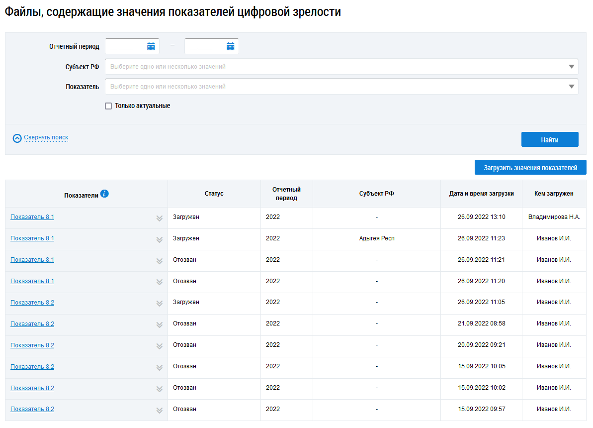 Для перехода к просмотру отчетности нажмите на раздел Аналитика и отчеты горизонтального навигационного меню и выберите пункт Реестр файлов показателей цифровой зрелости (Раздел меню «Аналитика и отчеты»). Отображается страница Файлы, содержащие значения показателей цифровой зрелости.