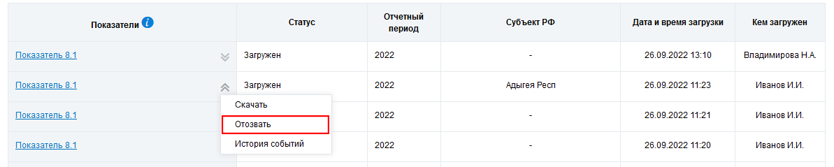 Для отзыва файла показателей цифровой зрелости нажмите на пункт Отозвать в выпадающем списке