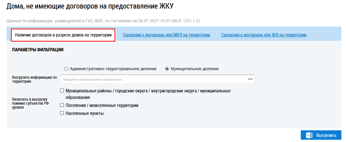Для формирования отчета в разрезе домов на территории в блоке Параметры фильтрации установите переключатель в нужное положение: Административно-территориальное деление или Муниципальное деление. Последовательно заполните остальные поля и нажмите на кнопку Выгрузить. Отображается окно подтверждения выгрузки отчета. Нажмите Да.