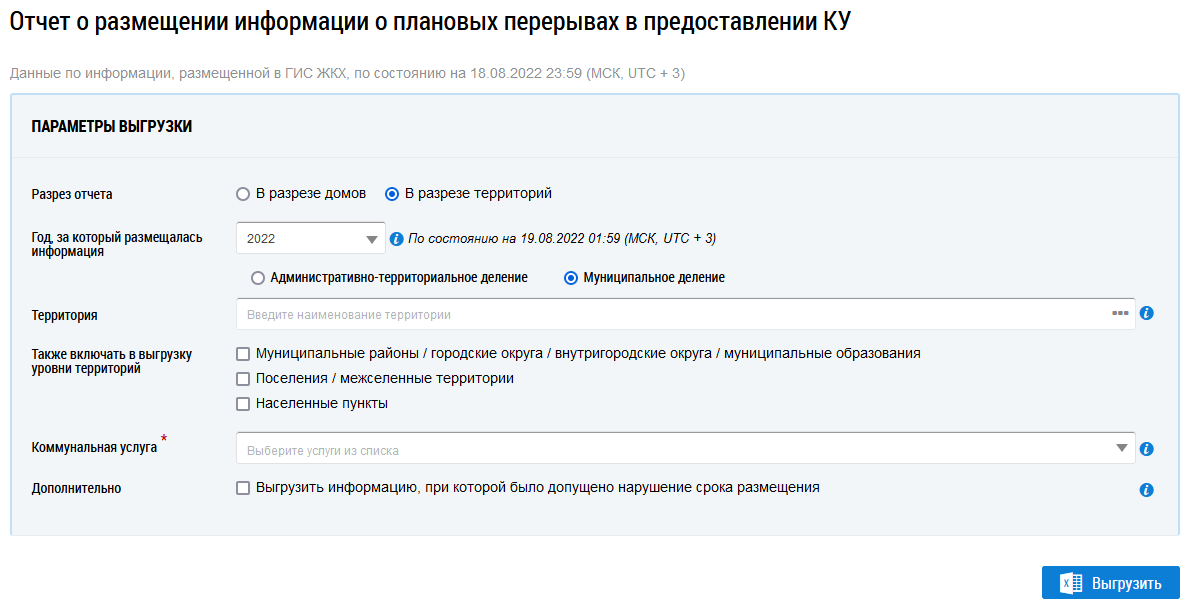 Отчет формируется на основе информации, размещенной в реестре перерывов в предоставлении коммунальных услуг.
