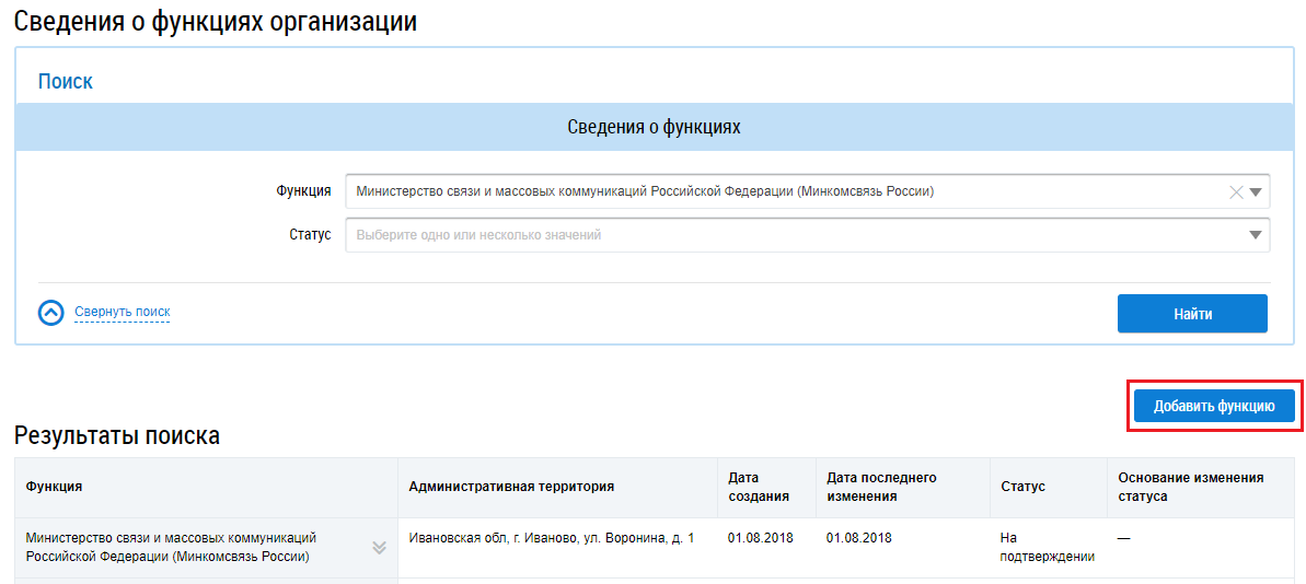Рис. 1. Страница «Сведения о функциях организации». Кнопка «Добавить функцию»