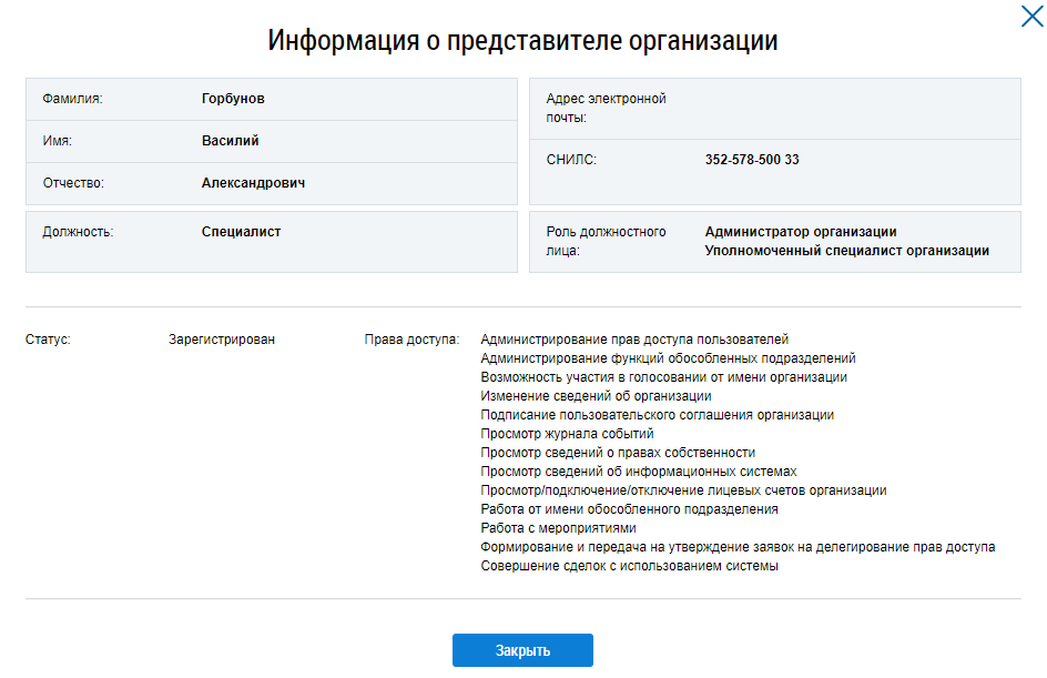 Отображается окно Информация о представителе организации с общей информацией о представителе организации.