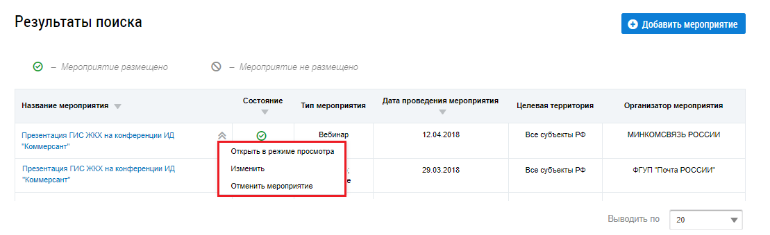 Рис. 1. Контекстное меню размещенного мероприятия