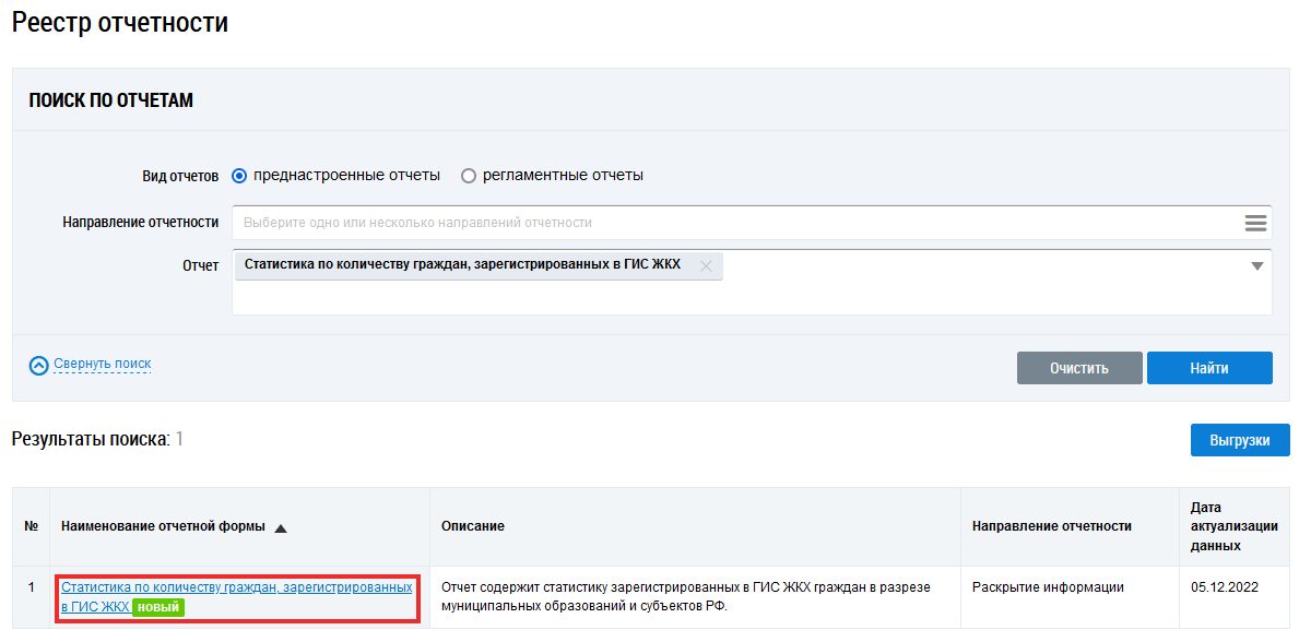 Для перехода на страницу отчета установите переключатель в положение Преднастроенные отчеты, выберите наименование отчетной формы в выпадающем списке строки поиска и нажмите на кнопку Найти. В блоке результатов поиска нажмите на гиперссылку с наименованием отчета Статистика по количеству граждан, зарегистрированных в ГИС ЖКХ.
