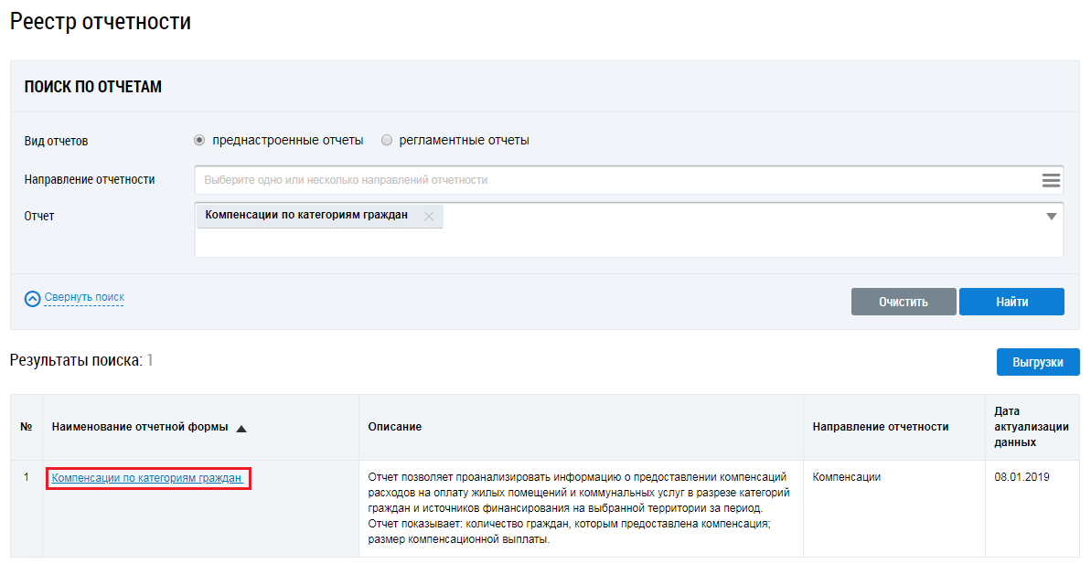 Для перехода на страницу Распределение сумм компенсаций расходов на оплату жилых помещений и коммунальных услуг по категориям граждан, получающим компенсации установите переключатель Вид отчетов в положение Преднастроенные отчеты. Затем нажмите на гиперссылку с наименованием отчета Компенсации по категориям граждан.