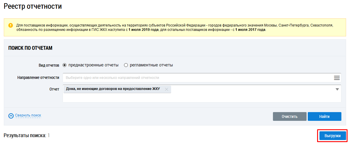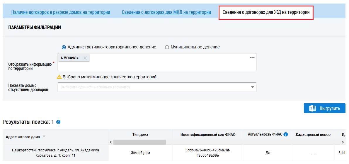 записей отображается подсказка об условиях отображения данных в результатах поиска.Последующие действия аналогичны тем, что описаны выше для формирования отчета в разрезе домов на территории (Страница «Дома, не имеющие договоров на предоставление ЖКУ», вкладка «Наличие договоров в разрезе домов на территории»).