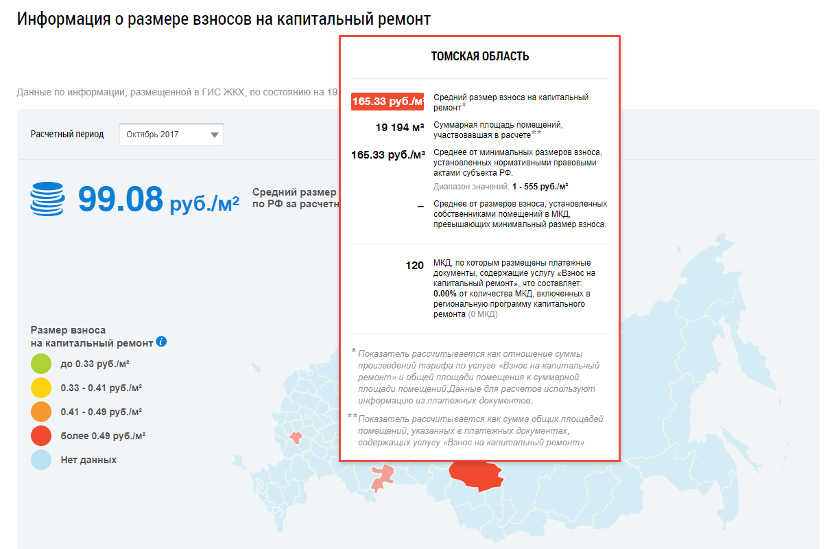 Под картой расположена таблица с подробной информацией о размере взносов на капитальный ремонт по территории.
