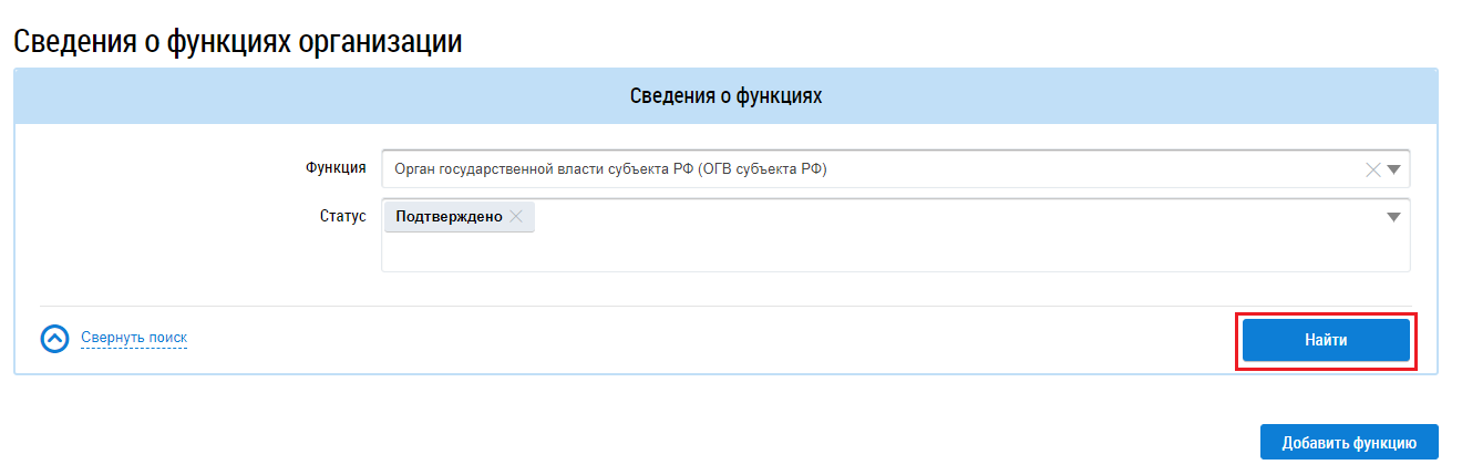 Для заполнения полей Функция и Статус следует выбрать значения из выпадающих списков. После ввода параметров поиска нажмите кнопку Найти.