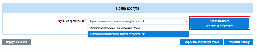 Заполните блок Права доступа. В случае наличия у организации нескольких функций выберите в выпадающем списке поля Функция организации необходимое значение и нажмите на кнопку Добавить права доступа для функции. Если у организации одна функция, данное поле не отображается.