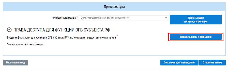 Укажите виды информации, по которым предоставляются права. Для добавления видов информации нажмите на кнопку Добавить виды информации.