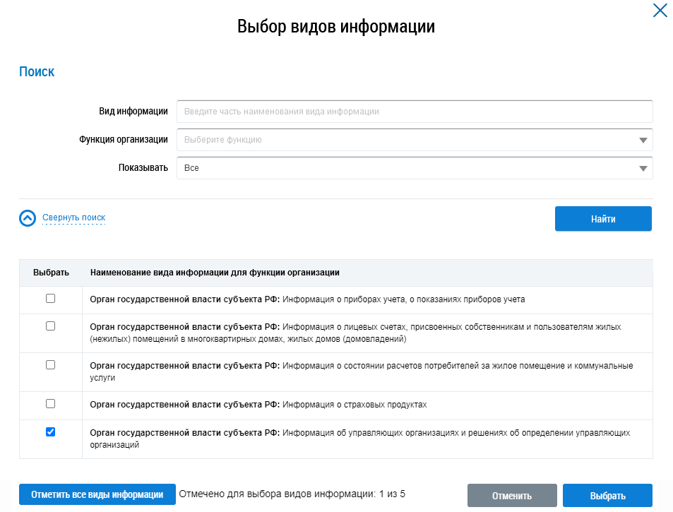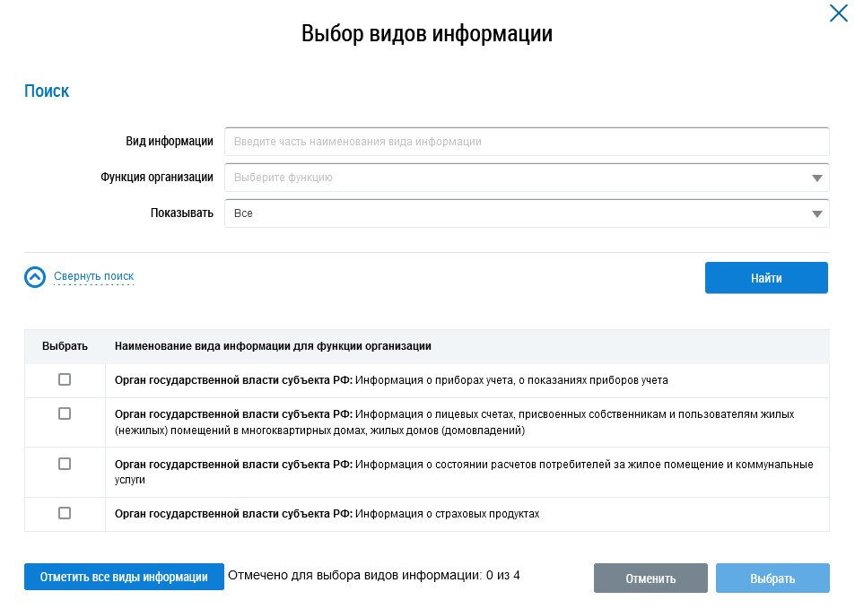 Установите флажки напротив необходимых видов информации или нажмите на кнопку Отметить все виды информации и нажмите на кнопку Выбрать (Окно «Выбор видов информации»).