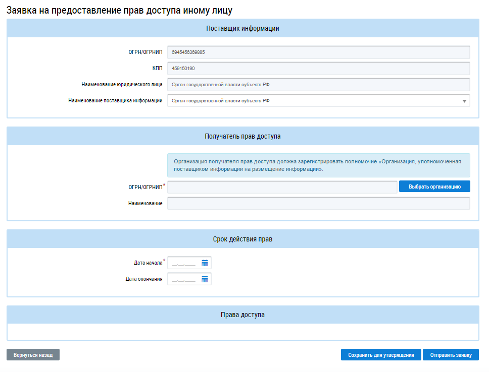 - руководителю организации - с возможностью сохранения заявки и отправки заявки получателю прав;